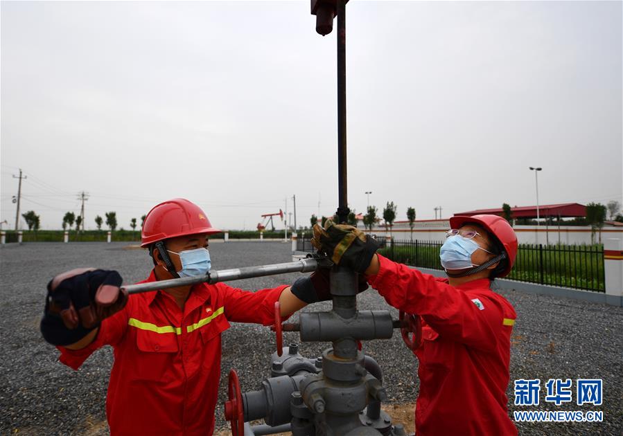 6月29日,馮萌萌(右)和同事在大港油田采油二廠二區(qū)內(nèi)查看設(shè)備運(yùn)行情況。新華社記者李然攝