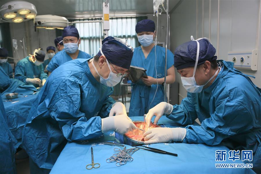 豬-猴異種肝心腎器官移植手術(shù)現(xiàn)場(chǎng)(6月13日攝)。日前,多基因編輯豬-恒河猴異種肝、心、腎器官移植在位于陜西西安的空軍軍醫(yī)大學(xué)西京醫(yī)院順利實(shí)施。研究團(tuán)隊(duì)使用豬內(nèi)源性逆轉(zhuǎn)錄病毒(PERV)敲除的13個(gè)基因修飾豬作為供體,將一個(gè)供體豬的肝、心、腎分別移植給3只恒河猴受體。目前,移植肝和對(duì)應(yīng)的受體猴已存活16天,突破國(guó)際上的豬-猴輔助性肝移植最長(zhǎng)存活時(shí)間記錄。這項(xiàng)研究有助于未來(lái)解決器官短缺造成的臨床器官移植發(fā)展受限難題。新華社發(fā)(張懿楠攝)