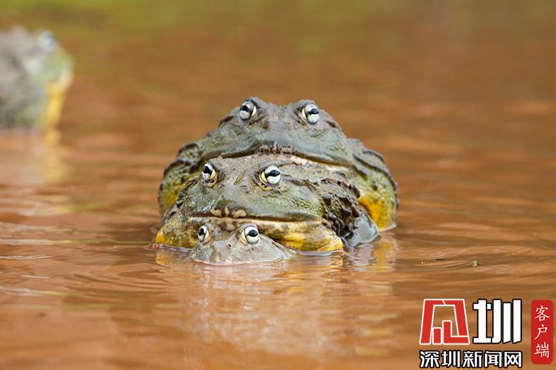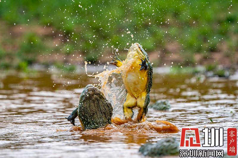 2020年6月30日?qǐng)?bào)道(具體拍攝時(shí)間不詳),南非波羅克瓦克,兩只雄性非洲牛蛙為了爭(zhēng)奪雌性牛蛙,在池塘中打架,這樣的情形十分罕見。畫面中,戰(zhàn)況十分激烈,一只非洲牛蛙在另外一只試圖逃到池塘邊緣時(shí)撕咬對(duì)手,甚至將另外一只拋向空中。這些精彩的照片是由南非開普敦?cái)z影師Temujin Johnson拍攝的。