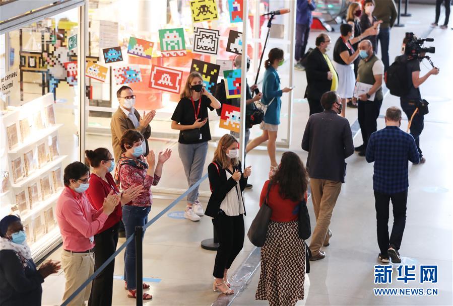 7月1日,法國(guó)巴黎蓬皮杜藝術(shù)中心的工作人員鼓掌歡迎參觀者。因新冠疫情關(guān)閉的法國(guó)巴黎蓬皮杜藝術(shù)中心于7月1日重新開門迎客。目前,中心只開放6層的臨時(shí)展區(qū)和4、5層的現(xiàn)代藝術(shù)常設(shè)展區(qū)。參觀者需提前網(wǎng)上預(yù)約參觀時(shí)段,11歲以上參觀者須佩戴口罩,參觀過程中保持安全距離。新華社記者高靜攝