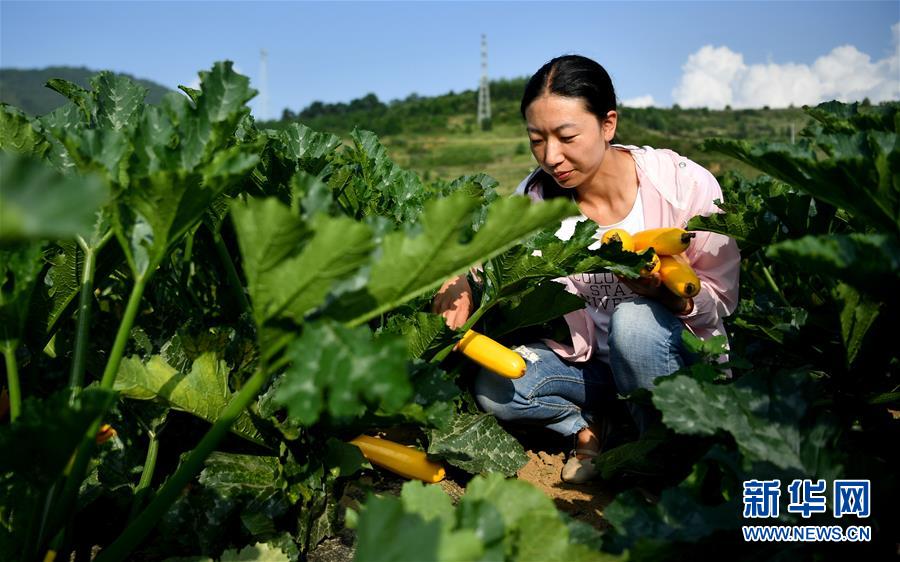 在陜西太白縣咀頭鎮(zhèn)咀頭街村供港蔬菜示范基地內,工作人員在采摘香蕉葫蘆(7月4日攝)。新華社記者劉瀟攝