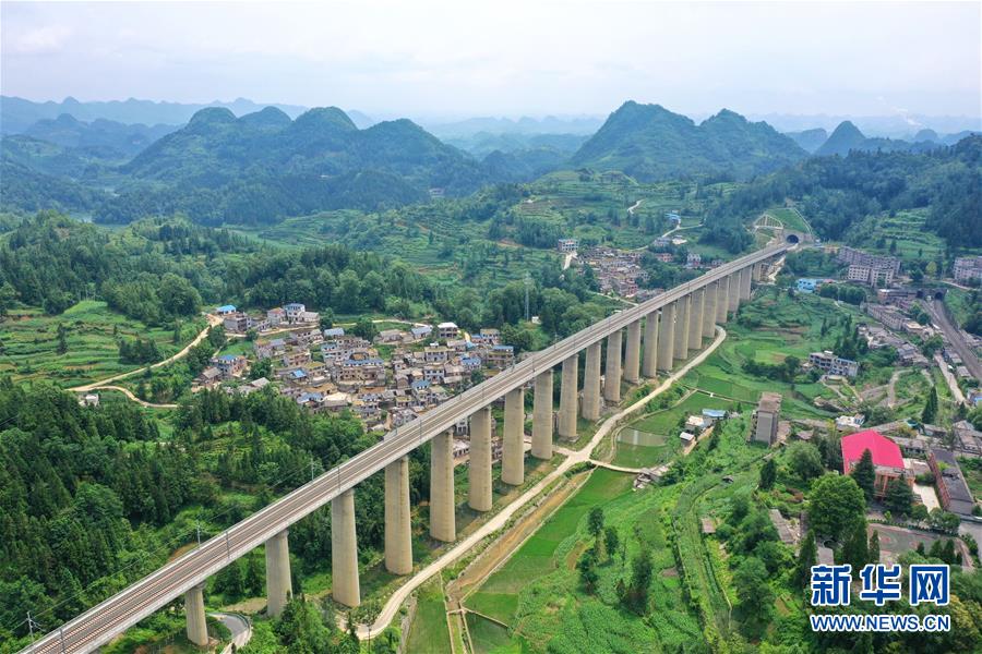 7月6日拍攝的安六鐵路岱港村特大橋(無人機照片)。當日,新建貴州安六鐵路(安順至六盤水)聯調聯試工作進入收尾階段,開通前的各項準備工作已基本就緒。安六鐵路線路全長約125公里,設計時速250公里,為國家I級雙線客運專線。建成投用后,貴陽至六盤水的鐵路旅行時間可從現在的3.5小時縮短為1小時左右,貴州省六盤水市將全面接入全國高鐵網。新華社記者劉續(xù)攝