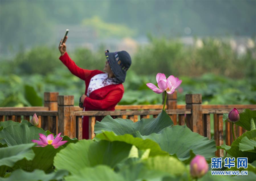 7月7日,游客在唐山市南湖公園內(nèi)的觀荷棧橋上拍照。近日,河北省唐山市南湖公園內(nèi)荷花競(jìng)相綻放,呈現(xiàn)出“接天蓮葉無窮碧,映日荷花別樣紅”的美麗景象,吸引了眾多游客前來觀賞。新華社記者楊世堯攝