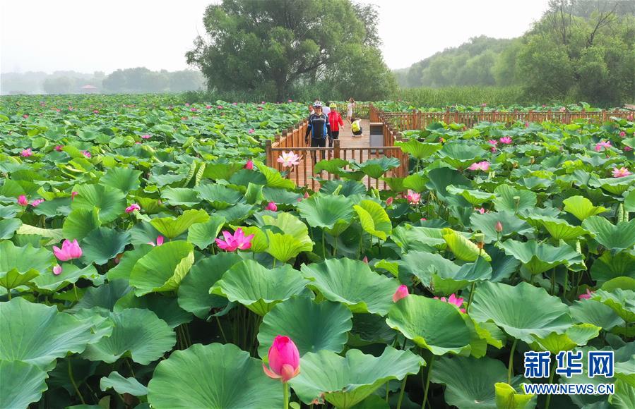 7月7日,游客在唐山市南湖公園欣賞盛開的荷花(無人機(jī)照片)。近日,河北省唐山市南湖公園內(nèi)荷花競(jìng)相綻放,呈現(xiàn)出“接天蓮葉無窮碧,映日荷花別樣紅”的美麗景象,吸引了眾多游客前來觀賞。新華社記者楊世堯攝