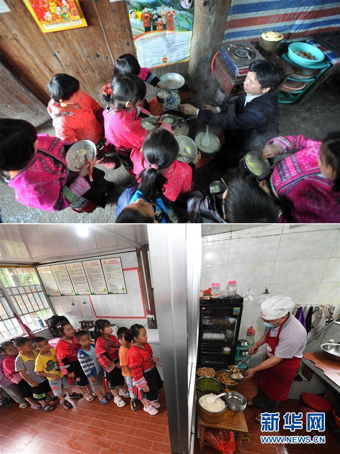 這是一張拼版照片,上圖:在廣西龍勝龍脊鎮(zhèn)江柳村翁江小學,余啟貴老師在給學生盛午飯(2013年2月26日攝);下圖:在廣西龍勝龍脊鎮(zhèn)江柳村翁江小學,余啟貴老師在給學生盛午飯(7月7日攝)。新華社記者陸波岸攝