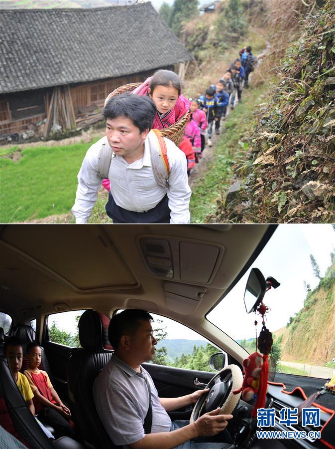 這是一張拼版照片,上圖:在廣西龍勝龍脊鎮(zhèn)江柳村,余啟貴老師在放學(xué)路上將一個走不動了的孩子背在背簍里,領(lǐng)著其他孩子一起回家(2013年2月26日攝);下圖:在廣西龍勝龍脊鎮(zhèn)江柳村,余啟貴老師開著自己的汽車帶著學(xué)生去學(xué)校(7月7日攝)。新華社記者陸波岸攝