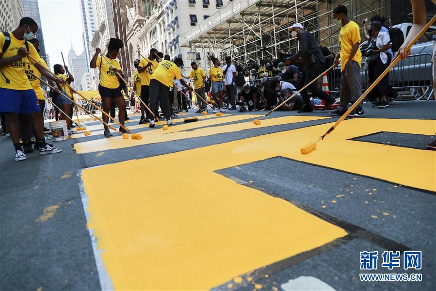 7月9日,在美國紐約第五大道特朗普大廈前,人們涂寫“黑人的命也是命”標(biāo)語。當(dāng)天,數(shù)十人在紐約第五大道特朗普大廈前的路面上涂寫“黑人的命也是命”標(biāo)語。紐約市計劃在多處地點(diǎn)涂寫“黑人的命也是命”標(biāo)語。新華社記者王迎攝