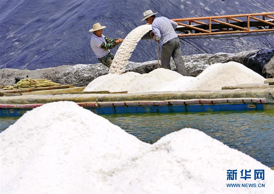 7月9日,唐山市曹妃甸區(qū)南堡鹽場的工人將收獲的春鹽裝船。在我國長蘆鹽區(qū)海鹽生產(chǎn)基地之一的河北省唐山市曹妃甸區(qū)南堡鹽場,一年一度的春鹽收獲工作即將結(jié)束,今年南堡鹽場的春鹽產(chǎn)量預(yù)計可達72萬噸。新華社記者楊世堯攝
