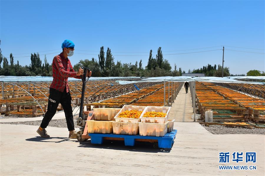 在新疆英吉沙縣一家合作社內,員工將去核的杏子推往曬杏棚(7月2日攝)。新華社記者高晗攝