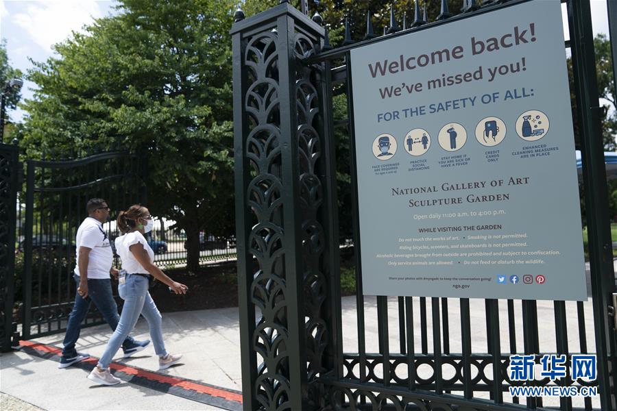 7月11日,人們?cè)诿绹A盛頓國家藝術(shù)畫廊雕塑公園游覽時(shí)經(jīng)過門口關(guān)于疫情防控的告示。新華社記者劉杰攝