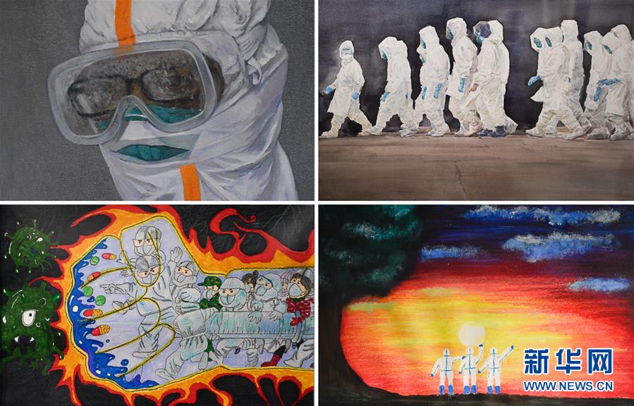 這是在吉林省抗疫主題美術·攝影作品展上展出的部分作品(拼版照片,7月11日攝)。近日,“大愛無疆——吉林省抗疫主題美術·攝影作品展”在吉林省工藝美術館與觀眾見面。展覽共展出抗擊新冠肺炎疫情主題書法、國畫、油畫、攝影等作品367件(組)。新華社記者 許暢 攝
