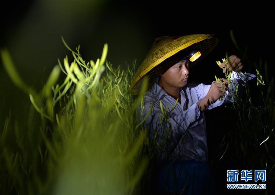 7月12日凌晨,祁東縣官家嘴鎮(zhèn)草源沖村,一名菜農(nóng)戴著頭燈采摘黃花菜。