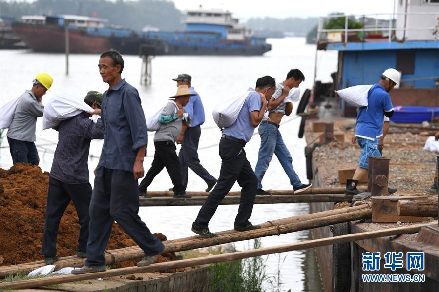 7月14日,當(dāng)?shù)卮迕裢簧习徇\(yùn)砂石袋。近日,受洪水影響,安徽省望江縣華陽(yáng)鎮(zhèn)境內(nèi)的江調(diào)圩內(nèi)部道路漫水,搶險(xiǎn)車輛無法進(jìn)入。當(dāng)?shù)胤姥床块T組織船只裝載砂石袋等防汛物資,運(yùn)往圩堤保防汛。新華社記者 劉軍喜 攝