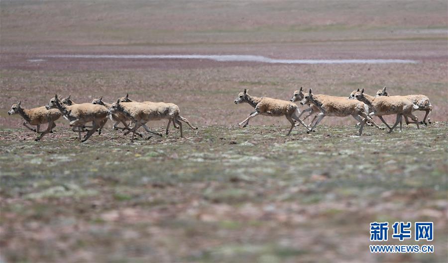 7月7日在可可西里卓乃湖區(qū)域拍攝的藏羚羊。目前正值藏羚羊產仔季。來自青海三江源、新疆阿爾金山、西藏羌塘等地的藏羚羊來到位于青海省可可西里腹地、被譽為“藏羚羊大產房”的卓乃湖區(qū)域產仔。新華社記者 薛玉斌 攝