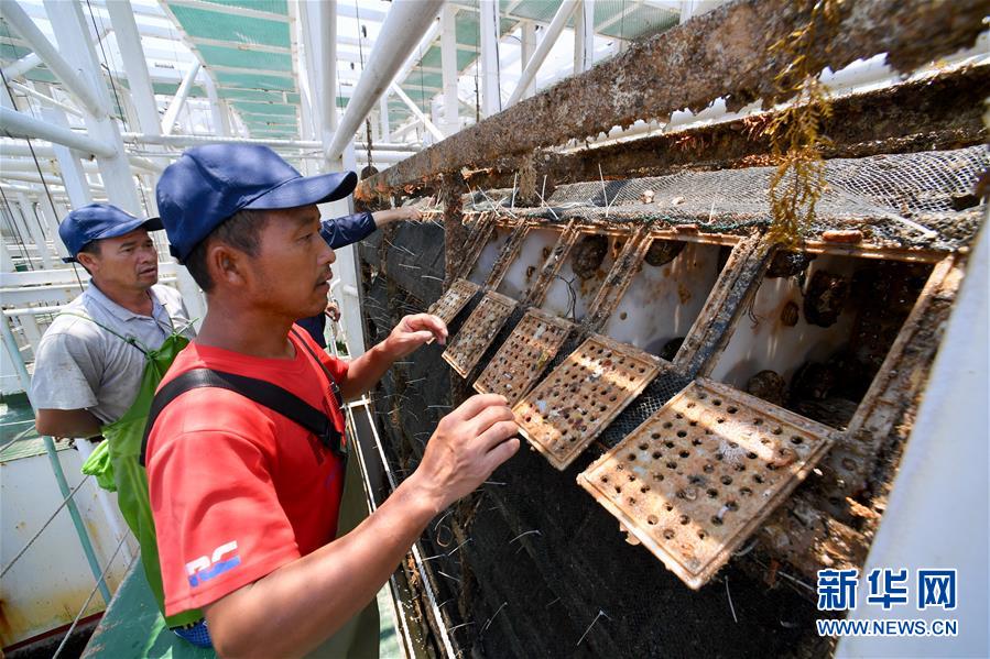 7月14日,在福建省連江縣深遠(yuǎn)海養(yǎng)殖平臺(tái)“福鮑一號(hào)”上,工人在查看鮑魚(yú)長(zhǎng)勢(shì)。新華社記者 姜克紅 攝