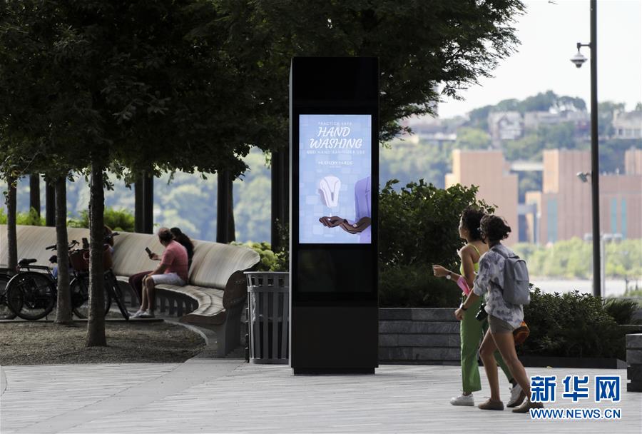 7月14日,在美國紐約一家尚未恢復(fù)店內(nèi)購物的購物中心外,電子屏介紹正確洗手的方式。美國約翰斯·霍普金斯大學(xué):截至北京時間15日6時34分,全球新冠確診病例達(dá)13258016例,死亡病例為576752例。美國是全球疫情最嚴(yán)重的國家,確診病例達(dá)3416222例,死亡病例為136319例。新華社記者 王迎 攝