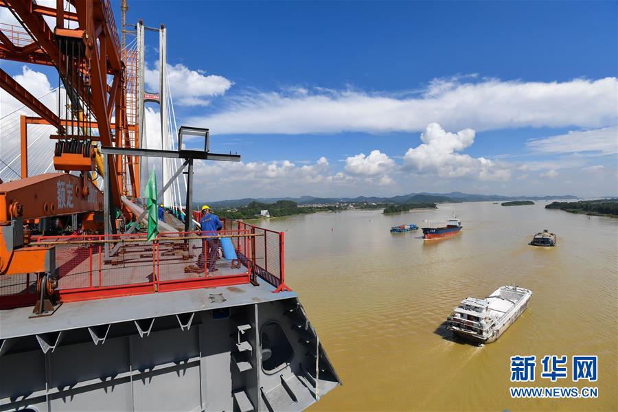 7月22日,廣州南沙港鐵路跨西江特大斜拉橋在進(jìn)行最后一組斜拉索吊裝。新華社記者劉大偉攝