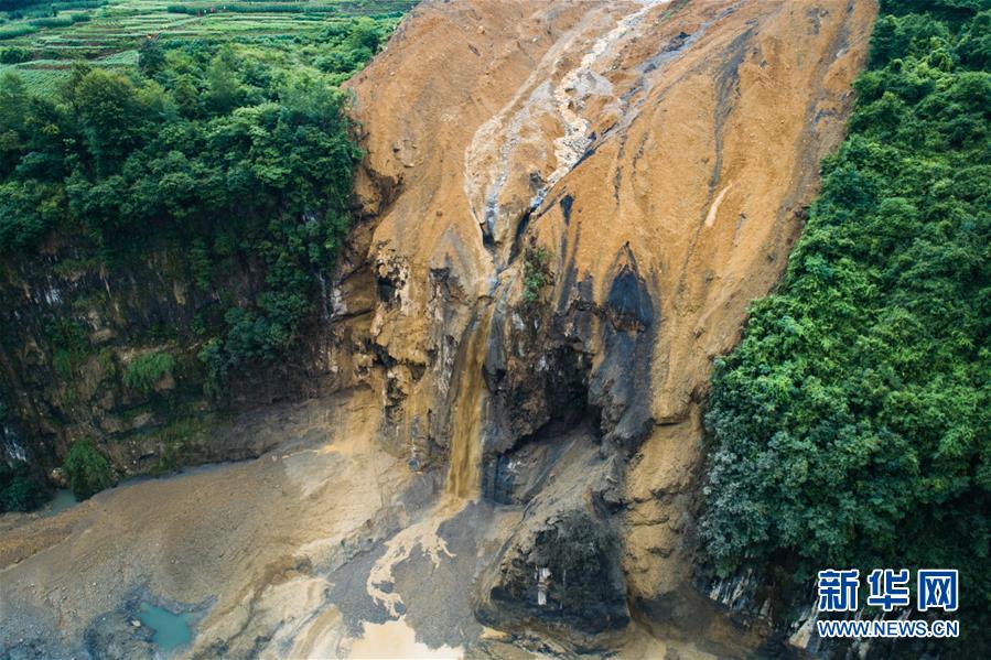 7月22日拍攝的因恩施州屯堡鄉(xiāng)馬者村山體滑坡形成的堰塞湖(無(wú)人機(jī)照片)。新華社記者肖藝九攝