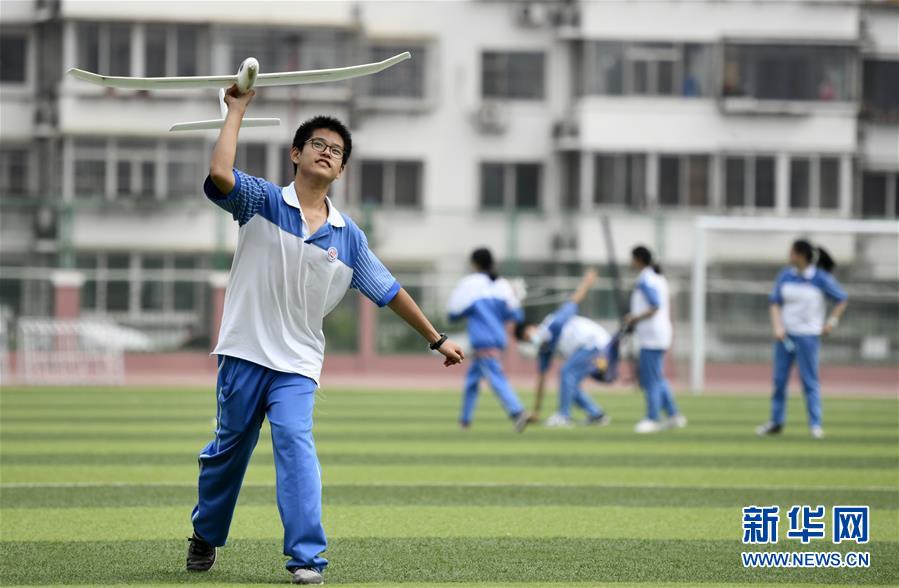 7月27日,參加暑期實踐營的學生在天津中學操場上體驗航模。新華社記者 李然 攝