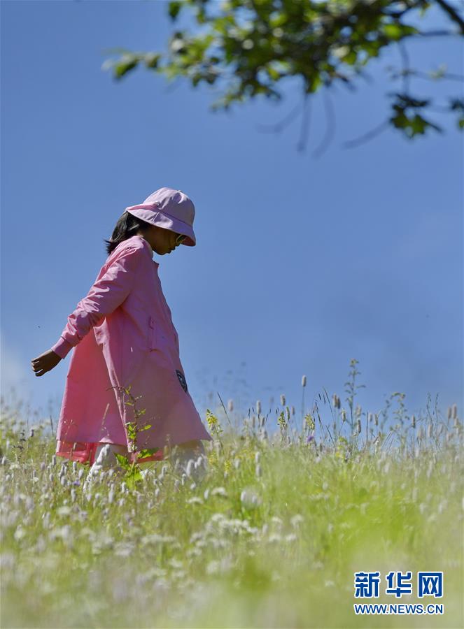 一名游客在魯朗旅游小鎮(zhèn)的高山牧場(chǎng)游玩(7月26日攝)。新華社記者 張汝鋒 攝