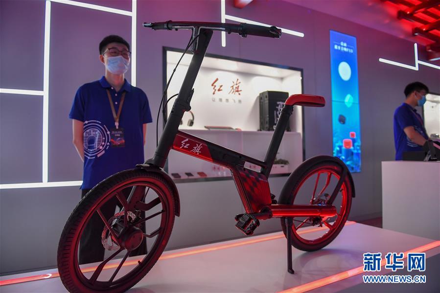 這是在紅旗創(chuàng)新大廈內(nèi)展出的紅旗電動(dòng)自行車(7月28日攝)。