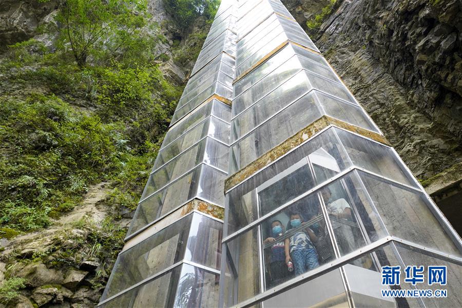 7月29日,游客乘坐天生三橋景區(qū)內(nèi)的絕壁觀光電梯游覽。新華社記者劉潺攝