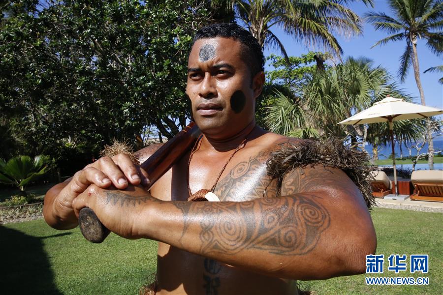 7月21日,在斐濟(jì)首都蘇瓦附近的納努庫奧博格海邊度假村,一名斐濟(jì)“武士”迎接游客。