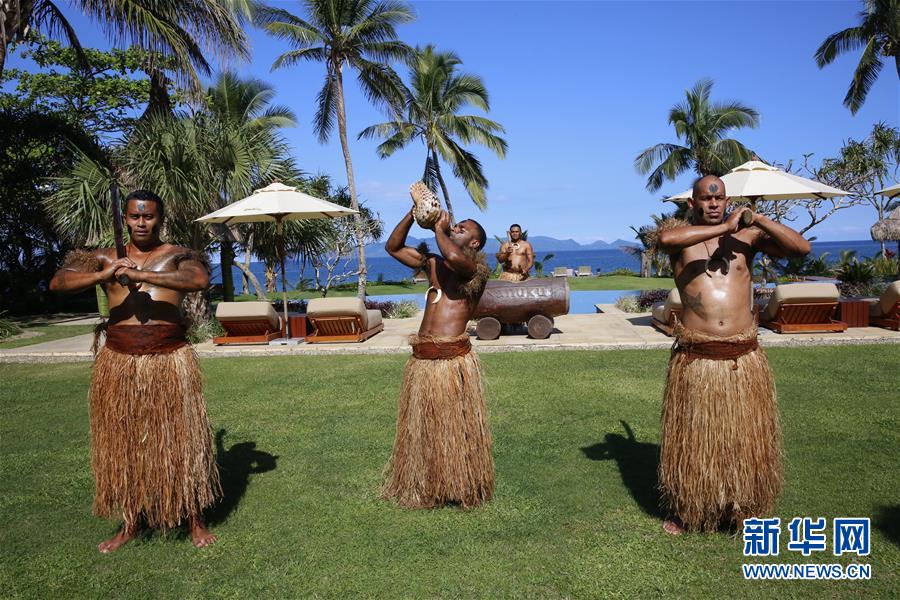 7月21日,在斐濟(jì)首都蘇瓦附近的納努庫(kù)奧博格海邊度假村,身穿草裙的斐濟(jì)“武士”為游客表演節(jié)目。新華社記者張永興攝
