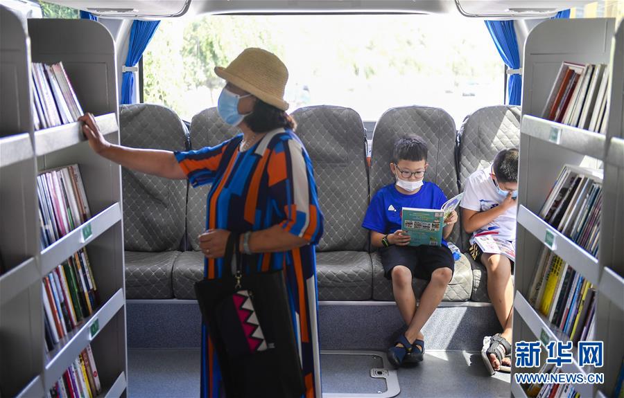 8月5日,小讀者在“流動(dòng)圖書館”里看書。三千冊(cè)圖書,一輛大巴車,穿梭在城市的街頭巷尾。在吉林長(zhǎng)春,長(zhǎng)春市圖書館利用流動(dòng)圖書車,定期在市內(nèi)15個(gè)固定服務(wù)點(diǎn)間巡回流動(dòng),為市民提供便捷的圖書借閱服務(wù)。新華社記者許暢攝