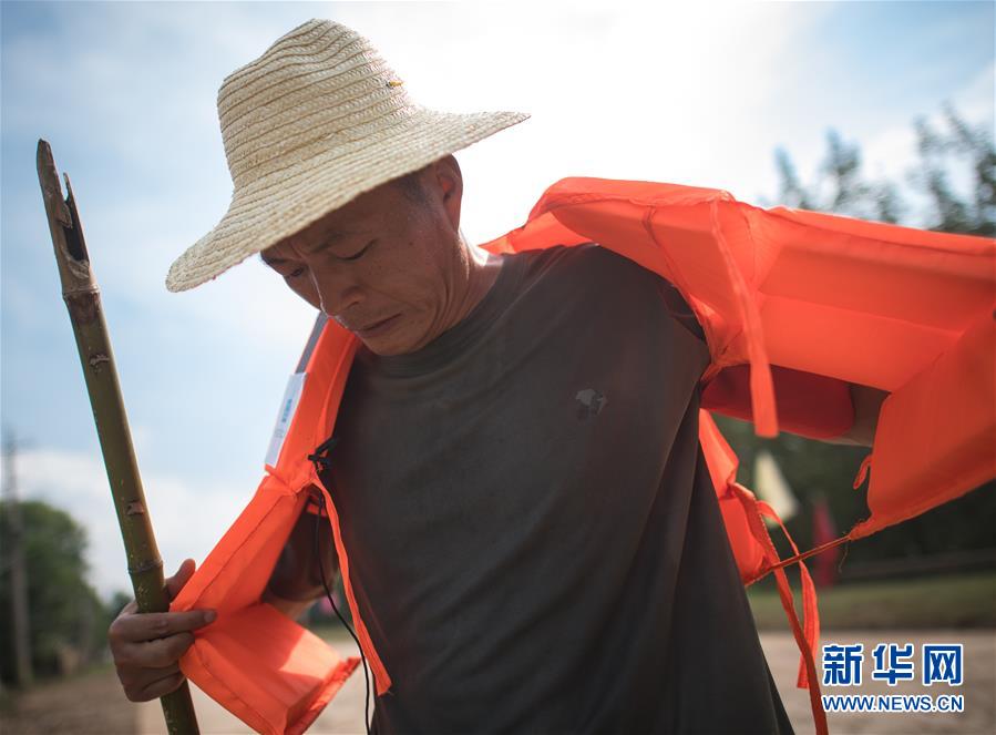 8月5日,夏德勤穿上救生衣準(zhǔn)備去堤壩的迎水面巡查。新華社記者肖藝九攝