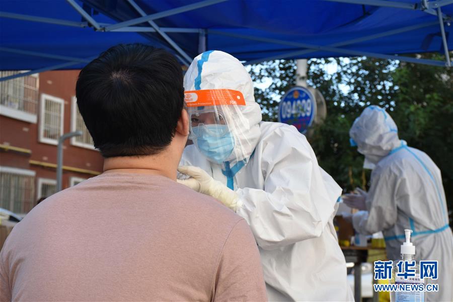 8月5日,醫(yī)務(wù)工作者在烏魯木齊市天山區(qū)山西巷社區(qū),對(duì)居民開(kāi)展免費(fèi)核酸檢測(cè)服務(wù)。新華社記者高晗攝