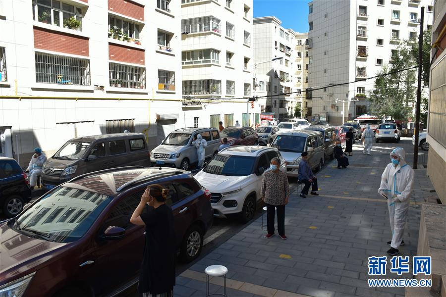 8月5日,居民在烏魯木齊市天山區(qū)山西巷社區(qū)排隊等待核酸檢測。新華社記者高晗攝