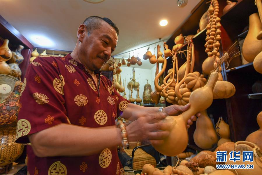 8月5日,侯景偉挑選適合創(chuàng)作的葫蘆。今年55歲的吉林四平人侯景偉自幼與家人學習雕刻、烙畫藝術。經(jīng)過多年潛心研究,他將浮雕和烙畫工藝相結合,通過拋光、起稿、雕刻、烙燙、套色等十余道工藝,制作展現(xiàn)傳統(tǒng)文化、民俗故事的葫蘆工藝品。2020年,侯景偉被評為四平市非物質(zhì)文化遺產(chǎn)項目侯氏葫蘆雕刻烙畫代表性傳承人。他說:“希望有更多人加入到非遺傳承隊伍中,讓小葫蘆‘講’出更多民俗故事?!毙氯A社記者張楠攝