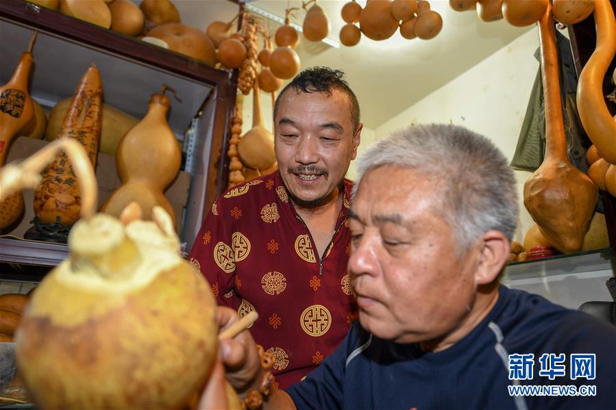 8月5日,侯景偉(左)向徒弟金志勇傳授技藝。今年55歲的吉林四平人侯景偉自幼與家人學習雕刻、烙畫藝術。經(jīng)過多年潛心研究,他將浮雕和烙畫工藝相結合,通過拋光、起稿、雕刻、烙燙、套色等十余道工藝,制作展現(xiàn)傳統(tǒng)文化、民俗故事的葫蘆工藝品。2020年,侯景偉被評為四平市非物質(zhì)文化遺產(chǎn)項目侯氏葫蘆雕刻烙畫代表性傳承人。他說:“希望有更多人加入到非遺傳承隊伍中,讓小葫蘆‘講’出更多民俗故事?!毙氯A社記者張楠攝