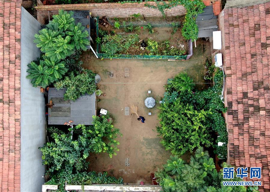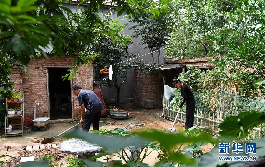 8月5日,王曉楠與父親在自家庭院內(nèi)勞作(無人機照片)。新華社記者郝源攝