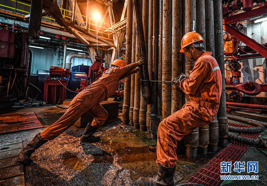 7月26日,在位于南海北部海域的勘探三號(hào)鉆井平臺(tái)上,鉆井工人在擺放鉆桿。新華社記者蒲曉旭攝