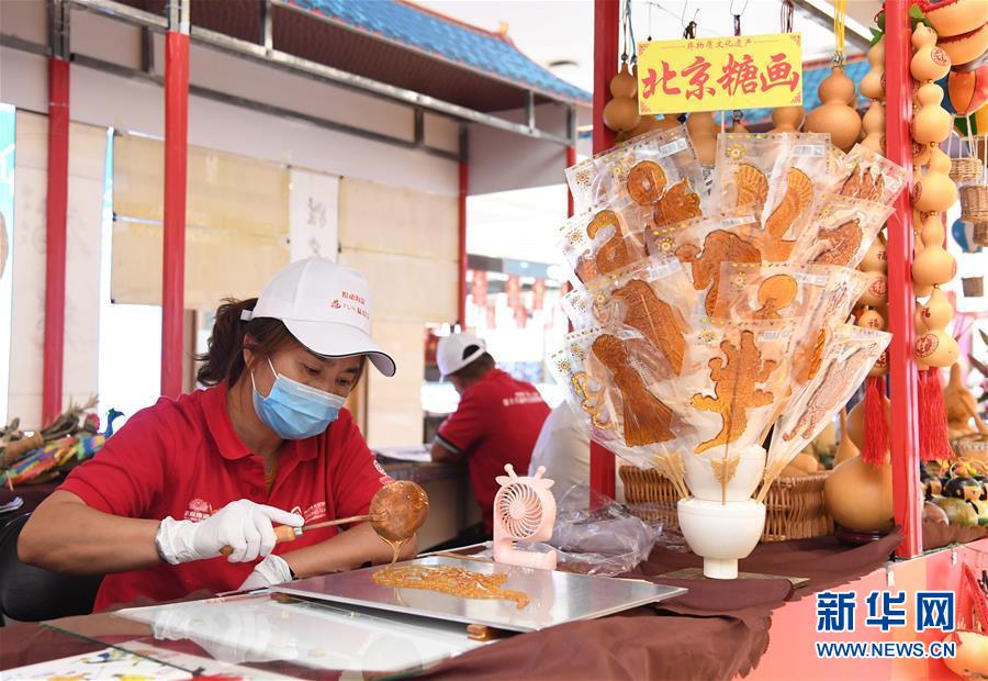 8月8日,在第十八屆中關(guān)村國(guó)際美食節(jié)美食美酒嘉年華文創(chuàng)非遺展示區(qū),工作人員制作糖畫(huà)。新華社記者 任超 攝