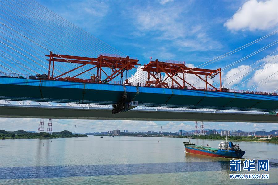 8月9日拍攝的廣州南沙港鐵路跨西江特大斜拉橋最后一塊鋼箱梁吊裝施工現(xiàn)場(無人機(jī)照片)。當(dāng)日,中鐵十一局承建的粵港澳大灣區(qū)基礎(chǔ)設(shè)施“硬聯(lián)通”重點(diǎn)工程——廣州南沙港鐵路跨西江特大斜拉橋完成最后一塊鋼箱梁吊裝作業(yè),大橋即將合龍。該橋位于廣東佛山市和江門市交界處,全長1117.5米。新華社記者劉大偉攝。
