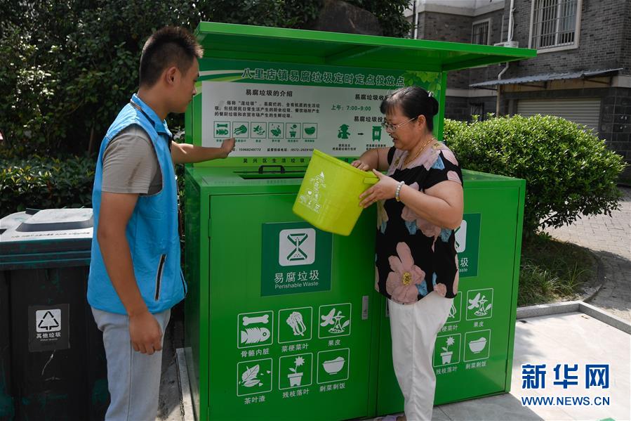 8月9日,湖州市吳興區(qū)八里店鎮(zhèn)百合苑居民(右)投放易腐垃圾。近年來,浙江省通過創(chuàng)新宣傳教育,多措并舉促進垃圾分類投放、收運及處置的良性循環(huán),引領(lǐng)垃圾分類成為城鄉(xiāng)居民的生活新風尚。新華社記者黃宗治攝。