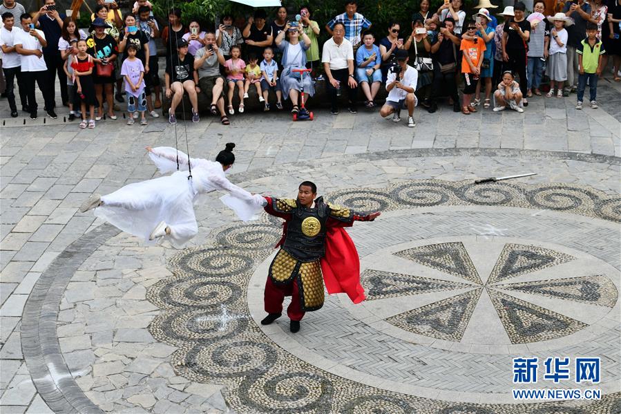 8月8日,游客在貴州省龍里縣“龍門鎮(zhèn)”武俠文化主題景區(qū)觀看武俠劇表演。近日,貴州省黔南布依族苗族自治州龍里縣境內(nèi)氣候宜人,龍里油畫大草原、“龍門鎮(zhèn)”武俠文化主題景區(qū)等景點(diǎn)吸引眾多游客前來觀光旅游。新華社記者楊文斌攝。