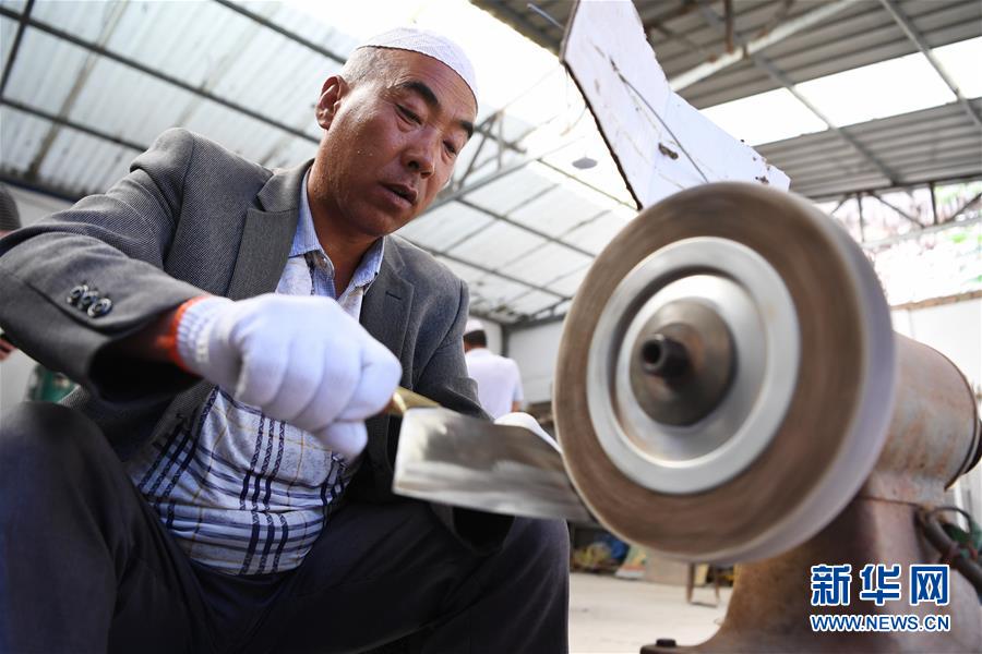8月10日,甘肅省臨夏回族自治州積石山縣大河家鎮(zhèn)的村民馬得勝在制作保安腰刀。新華社記者陳斌攝。