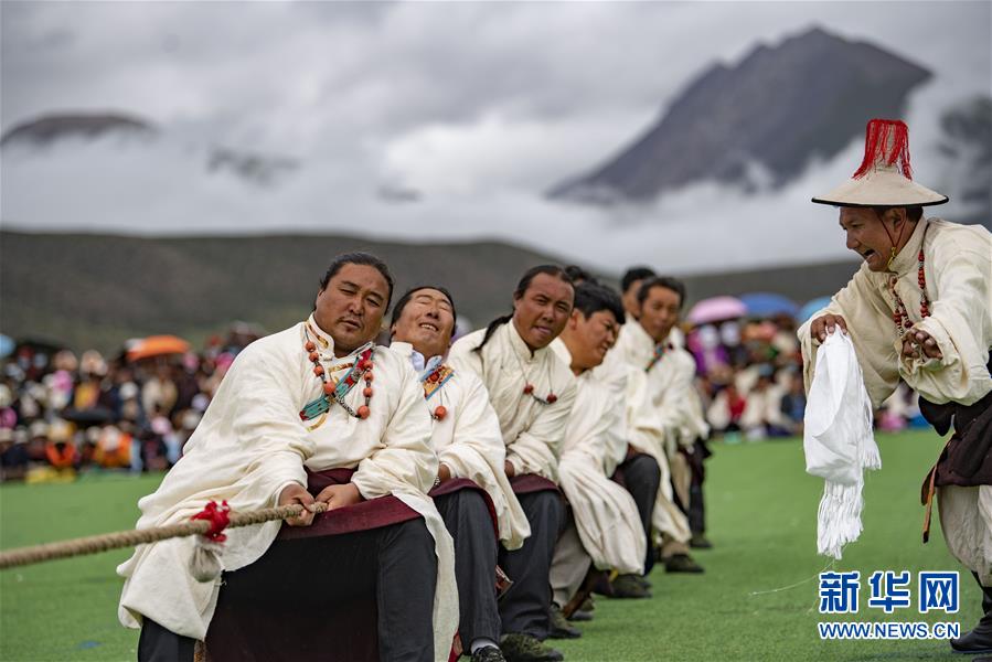 8月10日,當(dāng)雄縣牧民在拔河比賽中。新華社記者普布扎西攝。