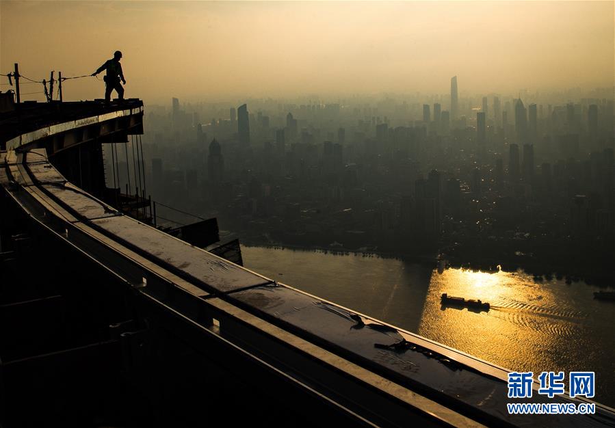 8月11日,工人在武漢綠地中心項(xiàng)目建設(shè)現(xiàn)場(chǎng)近500米的高空施工。