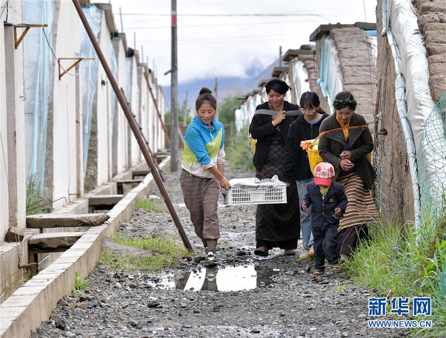 格桑旺姆(左三)和姐姐德吉卓瑪(左一)帶領雇傭的殘障村民巴珍(右一)搬運大棚出產(chǎn)的新鮮蔬菜(8月3日攝)。新華社記者 李賀 攝