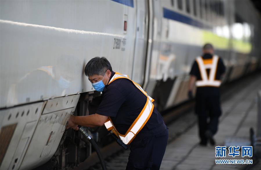 8月12日,長春火車站客運車間上水工王軍在給列車上水。進入暑運高峰,為了保障列車正常用水,每當一列火車??寇囌?,長春火車站的上水工就冒著酷暑將水管插進火車底部的輸水口,快速準確完成輸水作業(yè)。新華社記者 林宏 攝