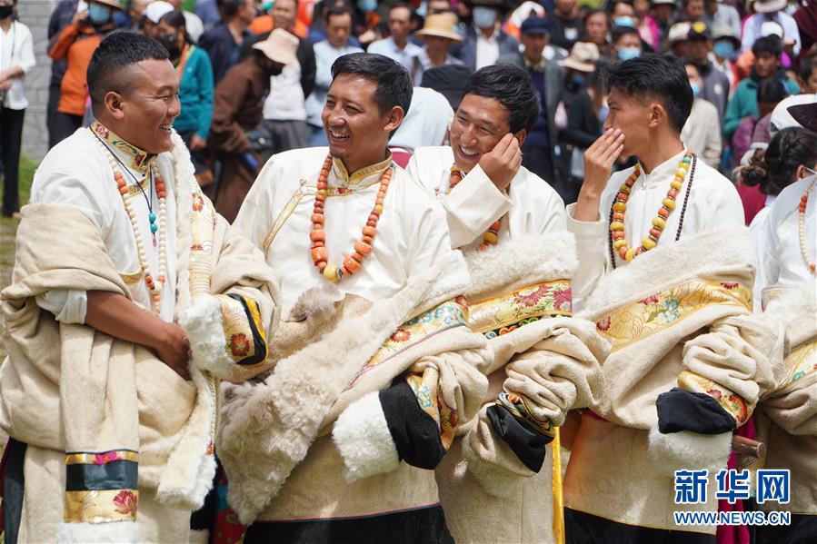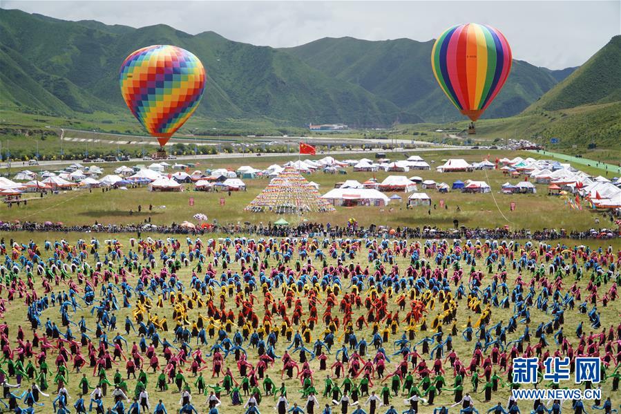 8月12日,演員在開(kāi)幕式上表演舞蹈。當(dāng)日,2020中國(guó)碌曲鍋莊舞展演暨甘南藏族自治州第六屆少數(shù)民族傳統(tǒng)體育運(yùn)動(dòng)會(huì)在甘肅省甘南州碌曲縣夏澤灘草原上舉行。開(kāi)幕式上,三千余名身著節(jié)日盛裝的演員和當(dāng)?shù)厝罕娫诓菰掀鹞?,雨后初晴的草原上充滿歡聲笑語(yǔ)。新華社記者 耿馨寧 攝
