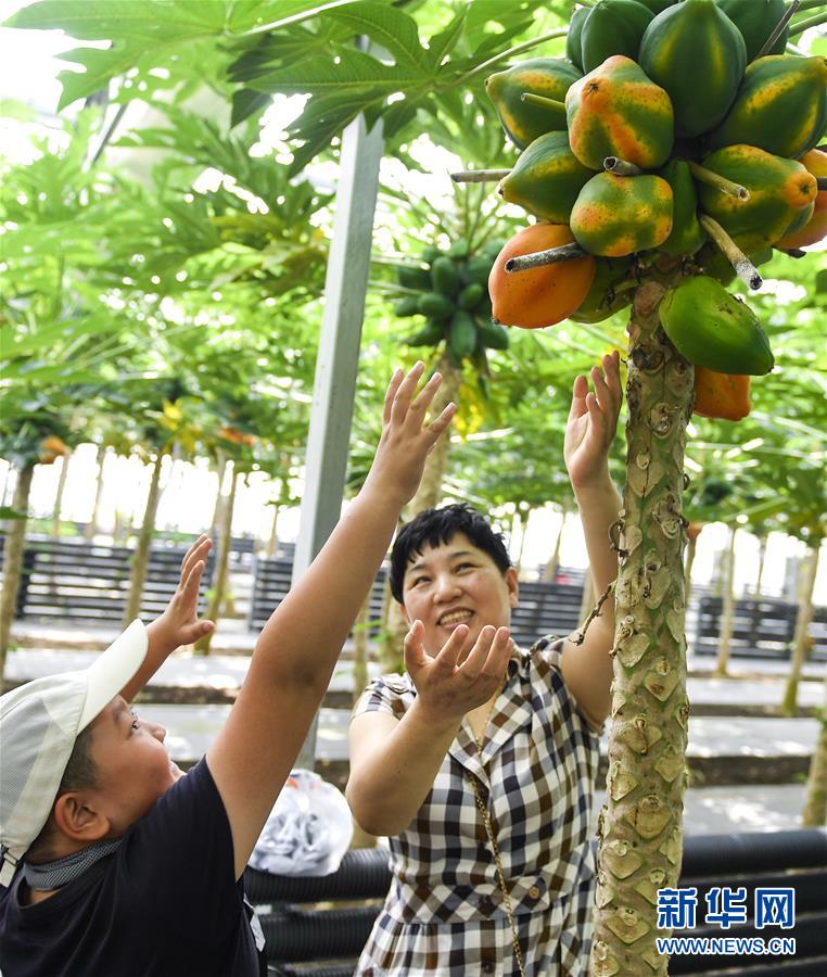 在吉林省永吉縣萬昌鎮(zhèn)宇豐紅果木瓜產(chǎn)業(yè)園,游客在大棚內(nèi)體驗木瓜采摘(8月12日攝)。近年來,吉林省永吉縣萬昌鎮(zhèn)積極優(yōu)化農(nóng)業(yè)產(chǎn)業(yè)結(jié)構(gòu),推進農(nóng)業(yè)生態(tài)觀光采摘園建設(shè),引進木瓜、香蕉等熱帶果品發(fā)展“南果北種”,助當?shù)剞r(nóng)民開啟一條致富新路。新華社記者 許暢 攝