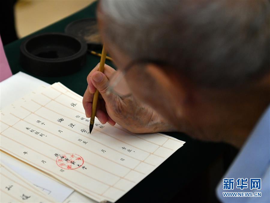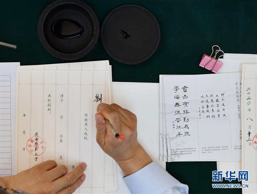 8月13日,陜西師范大學退休教師符有堂書寫錄取通知書。當日,陜西師范大學2020年手寫錄取通知書正式開筆。該校自2007年起采用毛筆書寫錄取通知書的方式,為新生傳遞佳音。今年,學校十余位退休教師、在職教師、校友代表等書法愛好者將為約4500名新錄取的本科生送上帶著墨香的大學錄取通知書。新華社記者張博文攝
