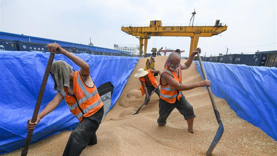 6月10日,在成都糧食集團(tuán)青白江國(guó)家糧食儲(chǔ)備庫(kù),工人在運(yùn)糧火車(chē)的貨廂內(nèi)卸貨。
