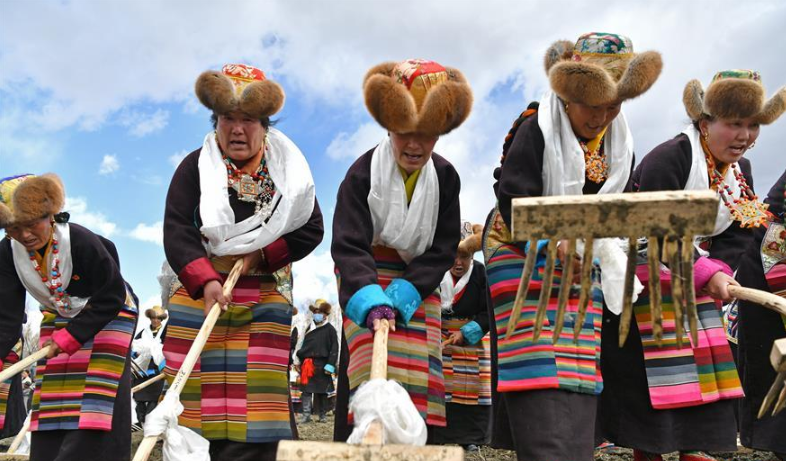 當(dāng)日,西藏各地男女老幼身著節(jié)日盛裝,駕著一輛輛由彩旗、花朵裝扮一新的拖拉機(jī),涌向待墾的農(nóng)田,載歌載舞迎來一年一度的開耕儀式。